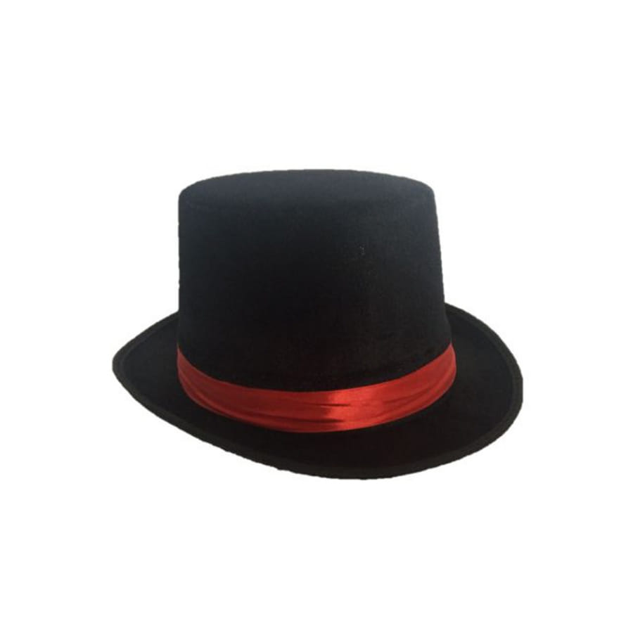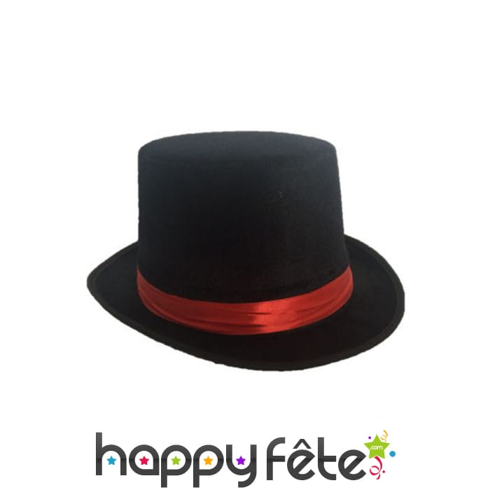 Classique et chic, ce Haut de forme noir avec galon rouge satiné est l'accessoire de soirée qui ira à merveille avec votre costume.