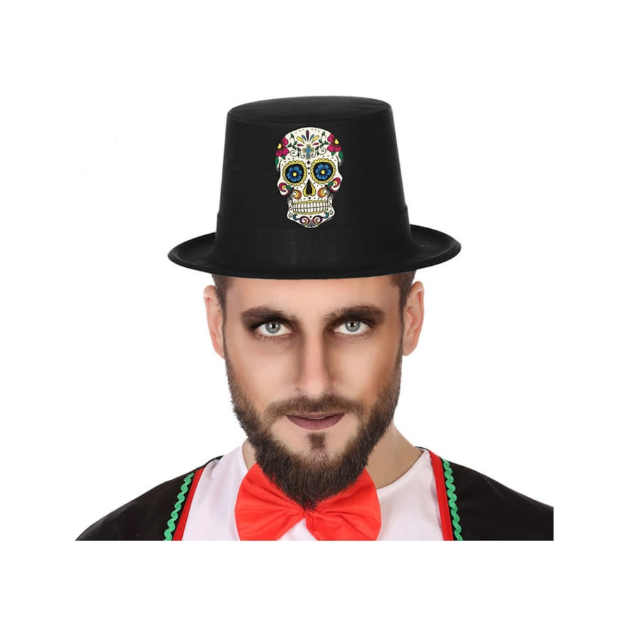 Le haut de forme noir avec symbole jour des morts apportera une touche chic à votre tenue d'Halloween.