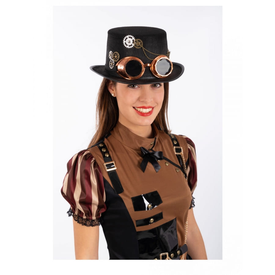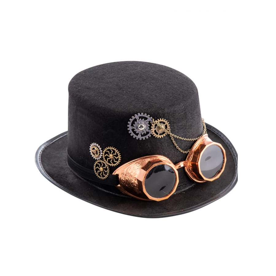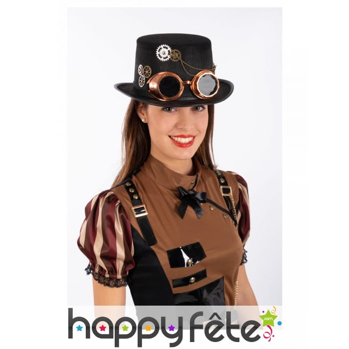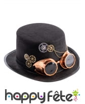 Ce Haut de forme steampunk noir avec lunettes, adulte complètera à merveille un déguisement rétro et chic.