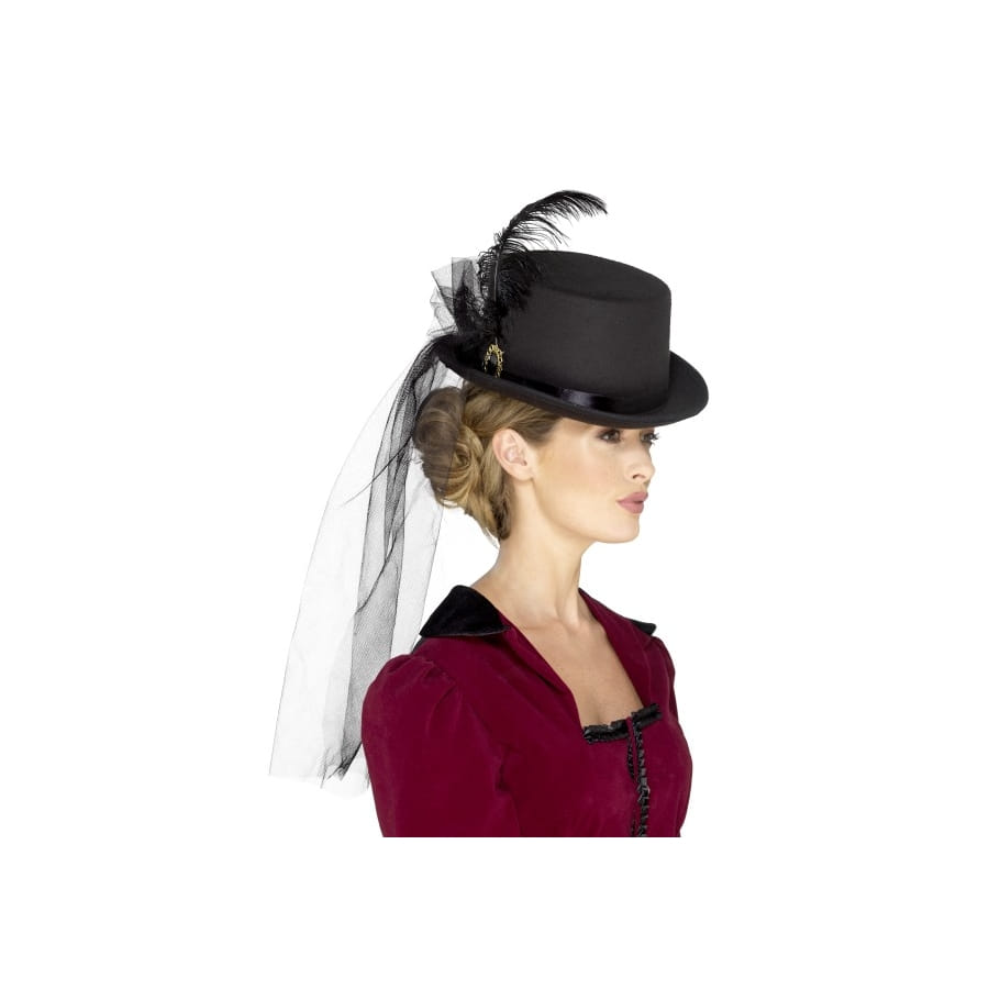 La haute société vous accueille dans son univers ! Vous craquerez assurément pour ce chapeau haut de forme victorien noir pour femme. Il est de couleur noire, orné d'une magnifique plume noire et agrémenté d'un léger voile à l'arrière. Comme sur la photo, vous pouvez l'accompagner d'un chignon bas pour un effet encore plus classe !