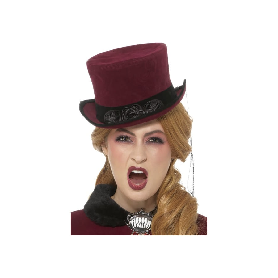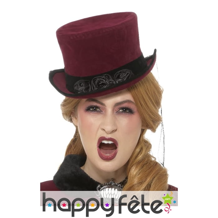 Mesdames, ayez du style à l'occasion de la fête des morts. Pour ce faire, choisissez votre accessoire avec soin. Aussi, nous vous proposons ce haut de forme victorien pour femme vampire, qui reste disponible sur notre site. Ce couvre-chef, avec sa couleur bordeaux, représente la classe. Au niveau de sa base, un ruban noir le borde, ainsi que des roses noires, pour un effet encore plus distingué.