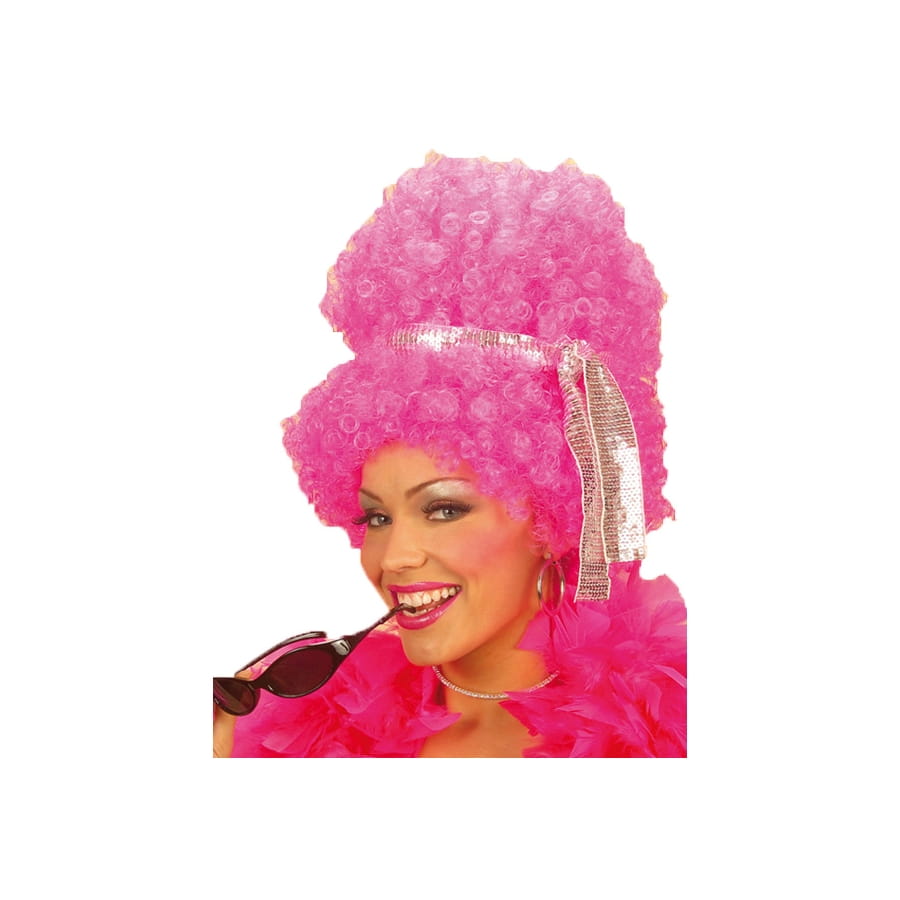 Petite initiation à la fashion attitude dans les années 70-80 ! Découvrez le genre de coiffure à la mode à l'époque à travers cette haute perruque rose afro disco. Vous aurez des cheveux de couleur rose fluo montés en chignon avec beaucoup de volume. De nature frisée, ils seront agrémentés d'un bandeau argenté.