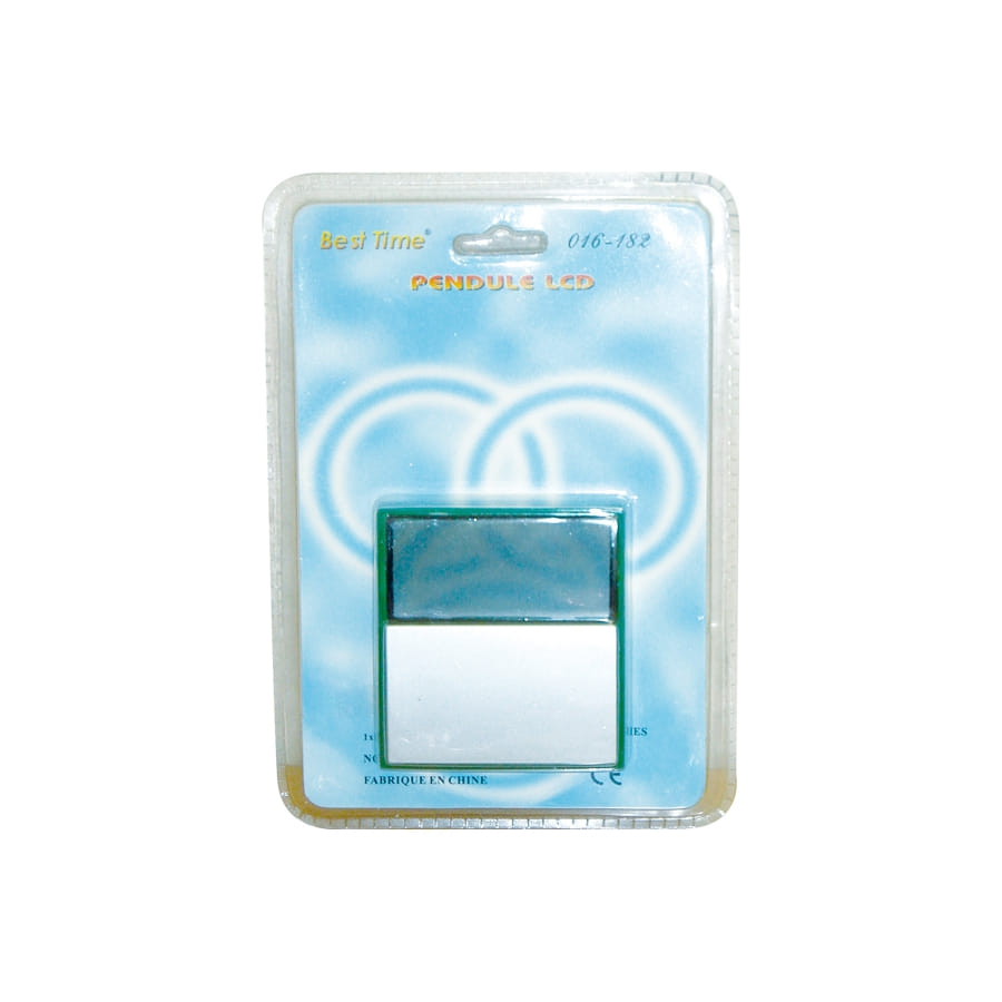 Pendule LCD de couleur blanc et bleu transparent. Elle mesure 6.5 centimètres de large sur 6 centimètres de haut et 1 centimètre d'épaisseur. Elle vous donnera l'heure avec élégance.