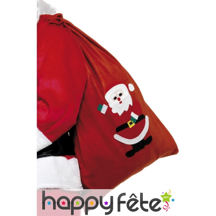 Hotte sac du Père Noël en tissu de couleur rouge avec dessin de Père Noël. Le sac mesure 90 centimètres de long et 60 centimètres de large. Mettez-y tous les cadeaux que vous comptez distribuer.
