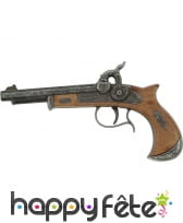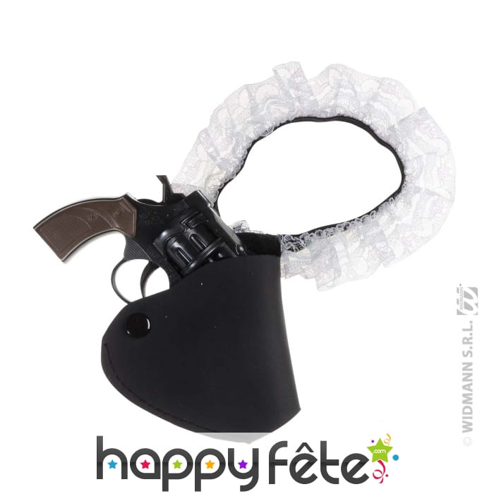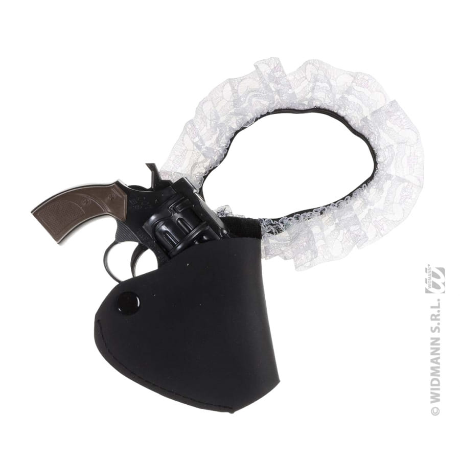 Jarretière de couleur blanche équipée d'un pistolet noir. Cet accessoire est idéal pour un déguisement de tueuse Western ou pour un enterrement de vie de garçon ou de jeune fille.