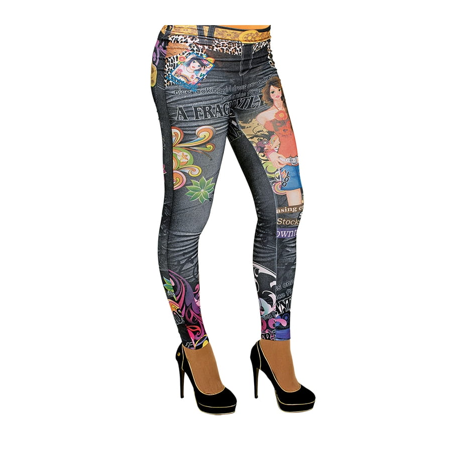 Tout ce qui est coloré va bien avec des déguisements hippie ou à thème fifty's et sixty's. Mais exceptionnellement, ce jegging très kitch et multicolore est aussi très bien pour compléter un déguisement de rockeur. Mettez juste un haut de couleur noir et des escarpins. Ce jegging à lui seul mettra très bien vos lignes en valeur, alors vous ne pourrez être que plus belle avec.