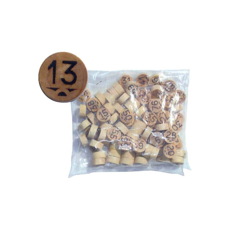 Jetons numérotés en bois pour loto, vendus en sachet de 90 pièces. Les jetons sont numérotés de 1 à 90. Organisez une partie de loto entre amis avec ces jetons.