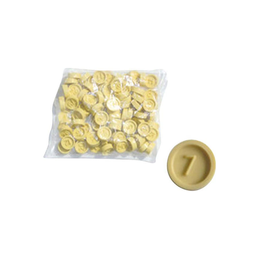 Jetons pour loto en plastique de couleur beige numérotés de 1 à 90, vendus en sachet de 90. C'est jetons sont indispensable pour une partie de loto réussie.