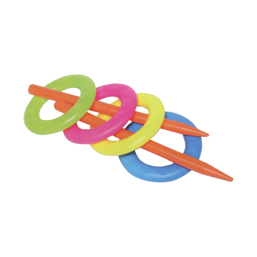 Jeu d'anneaux multicolore composé de 4 anneaux et de 2 piquets. Plantez les anneaux dans votre jardin ou dans le sable et lancez-les anneaux pour qu'ils s'y enroulent. Vous pouvez rendre le jeu plus ou moins difficile en choisissant la distance entre vous et l'anneau.