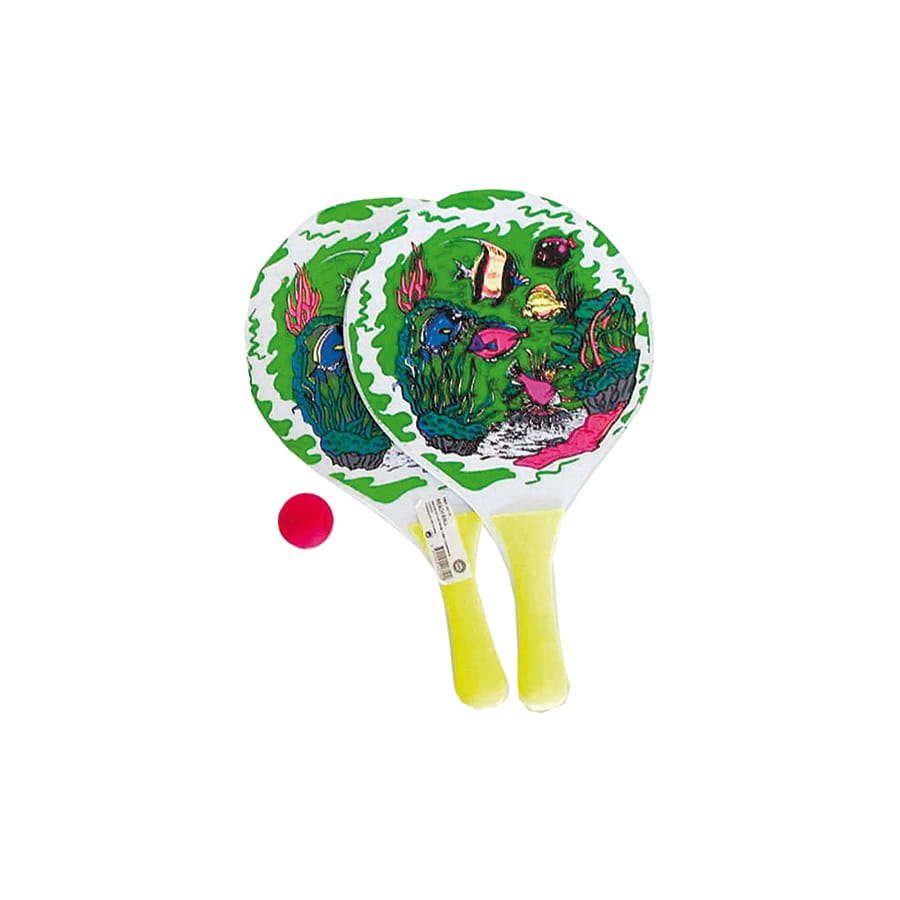 Jeu de "Beach Ball" composé de 2 raquettes ainsi que d'une balle. Chacune des raquettes mesure 38 centimètres. Au moment de votre commande, vous ne pourrez choisir ni le modèle ni la couleur des accessoires du set. Vous les recevrez comme présentée. C'est un moyen idéal de passer une journée formidable à la plage.