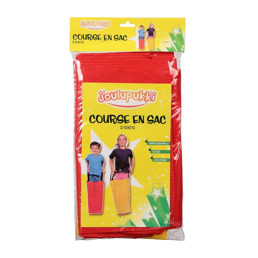 Qui sera le plus rapide ? Avec le jeu de course en sac, il faut sautiller jusqu'à la ligne d'arrivée tout en se gardant de ne pas tomber. Celui-ci comporte deux sacs de différentes couleurs. Il s'agit de modèles non-tissés polypro équipés d'anses permettant aux enfants de se déplacer plus facilement. Chaque sac est prévu pour une personne et il peut supporter tous les poids.