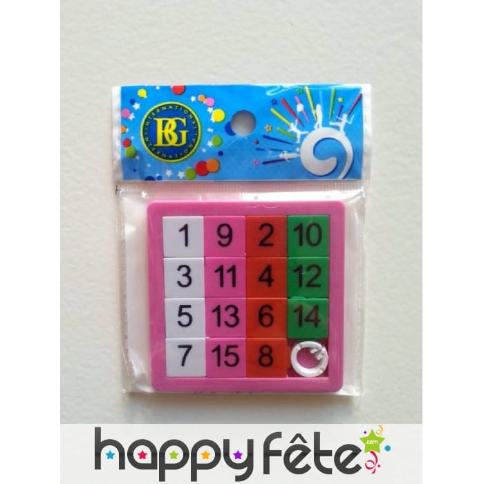 Jeu de patience "Pousse-numéro" mesurant 6,5 centimètres de côté. Ce jeu est un moyen intelligent et éducatif de distraire les enfants en leur apprenant l'ordonnancement des numéros. Vendu à l'unité, il existe en plusieurs coloris qu'il n'est pas possible de choisir au moment de la commande.