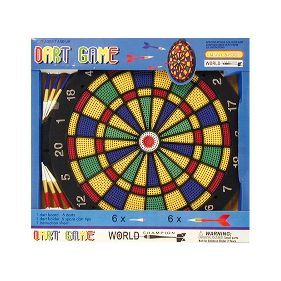Jeu de fléchette composé d'une cible de sécurité, de 6 fléchettes en plastique et de 6 protections en plastique pour les fléchettes. La cible mesure 30 centimètres de diamètre. Ce jeu de fléchettes multicolore est idéal pour faire passer le temps en famille.