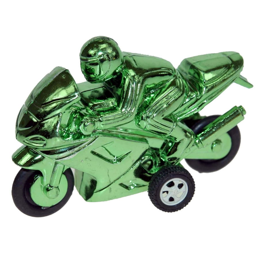 Ce jouet rempli de style sera parfait pour sa chambre ! Les petits garçons aiment tous collectionner les véhicules de transport. Cette fois-ci, vous avez affaire à une jolie moto avec pilote, tous deux teints en couleur métallisée. Le jouet fait 85 mm de dimension. A part le fait de vivre de palpitantes aventures, cet article va aussi magnifiquement décorer son étagère. En effet, il ne passe pas inaperçu avec sa brillance et son élégance. Plusieurs coloris sont possibles, mais vous ne pourrez pas choisir la couleur à la commande.
