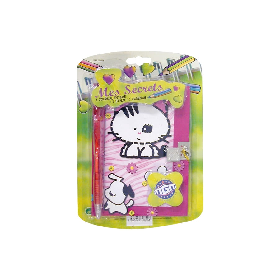 Ce journal intime sera parfait pour un cadeau d'anniversaire a une petite fille. Elle sera ravis de raconter dans sa journée et elle pourra renfermer ses secrets grâce au cadenas qui est inclus avec le journal intime. Le journal est rose avec un chien et un chat dessus de couleur blanc. Il y a aussi un stylo rouge avec.