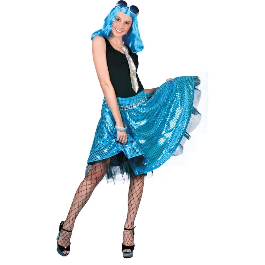 D'une longueur de 55 cm avec une coupe évasée, la jupe bleue disco recouverte de sequins est réalisée à base d'un tissu fin.