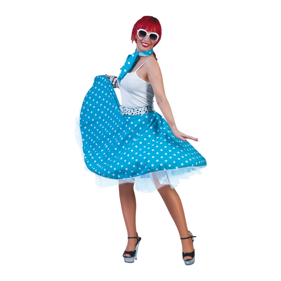 Nous vous présentons notre jupe bleue à pois blancs avec foulard années 50.