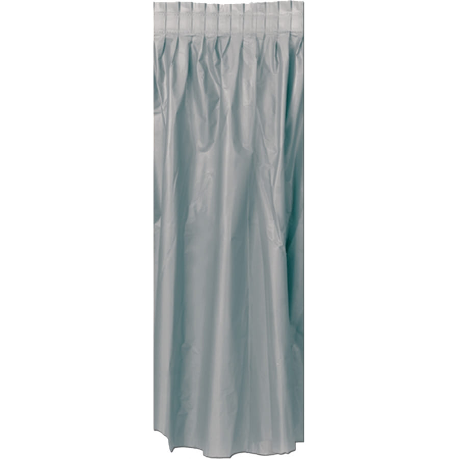 Jupe de table entièrement en plastique de couleur argentée. La taille de cette jupe est de 73 centimètres de longueur sur 4 m 30 de largeur. Cette magnifique jupe pourra vous servir de décoration pour un mariage, un carnaval, la Pâques, un anniversaire, la Noël ou le Nouvel An.