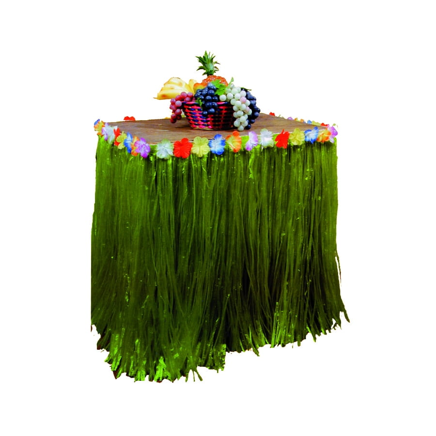 Jupe en rafia de couleur verte pour table. La taille de cette jupe est de 2, 70 mètres sur 80 centimètres. Elle est parfaite pour une décoration exclusivement hawaïenne ou antillaise.
