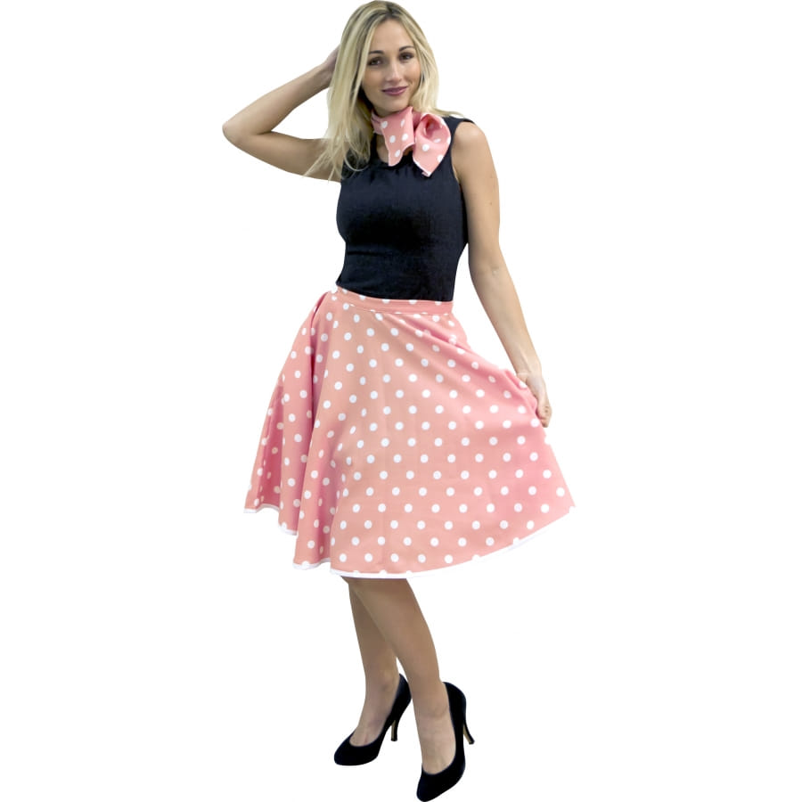 Déguisement Rock'n Roll, pour femme, composé d'une jupe ajustable et d'un foulard saumon à pois blancs. Vous pourrez ajuster la jupe à une taille 36, 38, 42 ou 44. Elle mesure 60 centimètres à partir de la taille tandis que le foulard fait 80 centimètres de long sur une largeur de 10 centimètres. Cet ensemble sera idéal pour une soirée Rock'n Roll ou pour une soirée années 50-60.