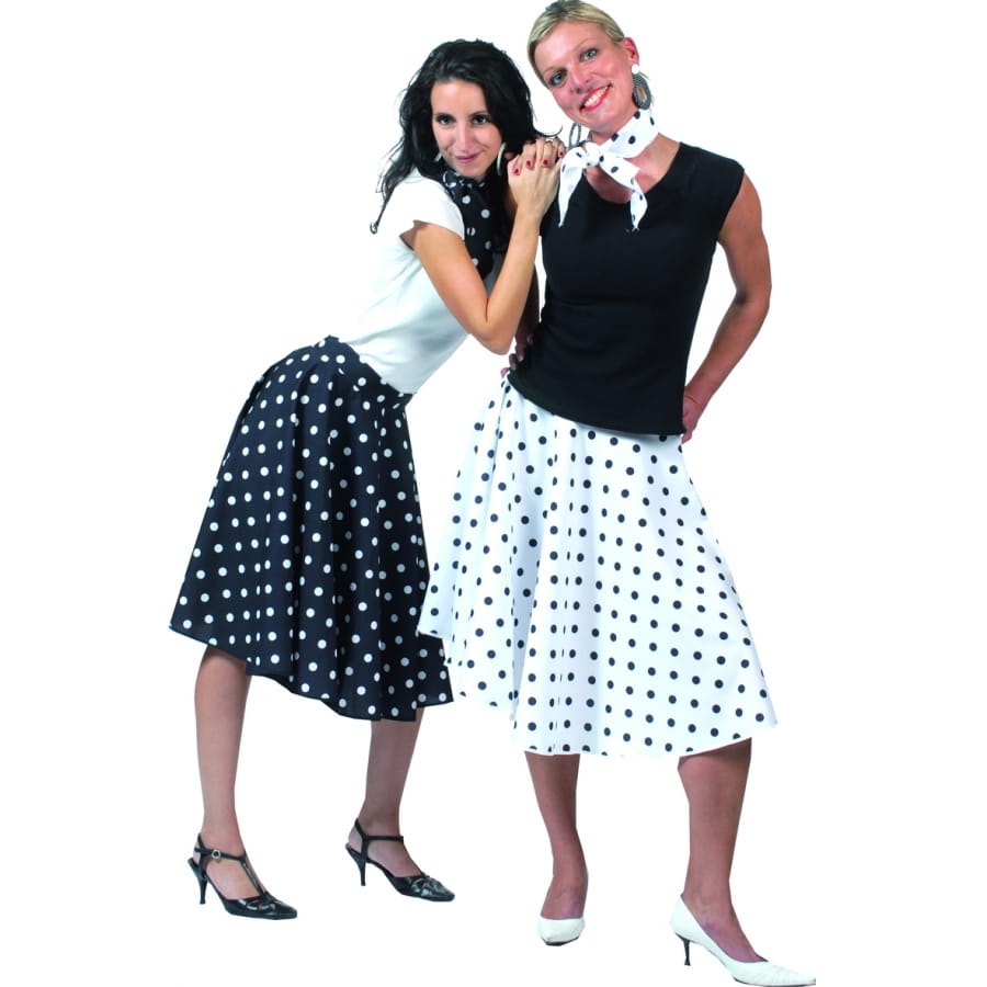 Set Rock'n Roll, pour femme, composé d'une jupe et d'un foulard noirs à pois . La jupe est à tailles ajustables de 36, 38, 40 ou 44 et mesure 60 centimètres de long. Le foulard mesure 80 centimètres de long sur 10 centimètres de large. C'est un ensemble idéal pour se déguiser en danseuse.