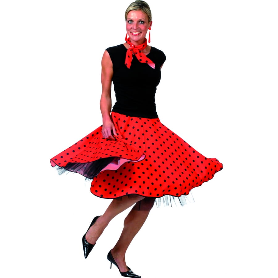 Vous n'allez pas cesser de swinguer dans cette jupe rock'n roll. Vous bougerez dans tous les sens dans cet accessoire de déguisement. Vous ne le porterez pas seulement lors une soirée rock n roll mais également les pour soirées des années 50. Cette jupe de 60 cm à partir de la taille et ajustable grâce aux positions de 4 boutonnière taille 36, 38,42 et 44. La jupe est rouge avec des pois noir avec un liseret noir sur le bas de la jupe. Le costume est aussi composé d'un foulard qui fait environ 80cm de long et de 10 cm de large.
