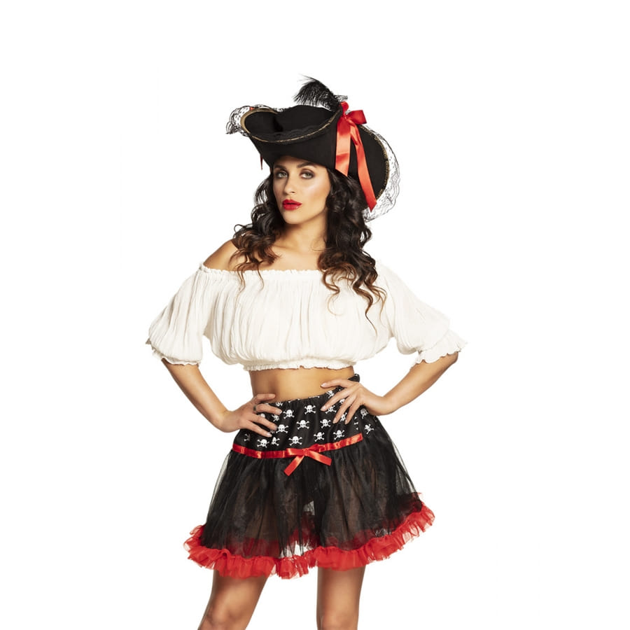 Le jupon de pirate rouge et noir avec têtes de mort est un accessoire réservé aux femmes.