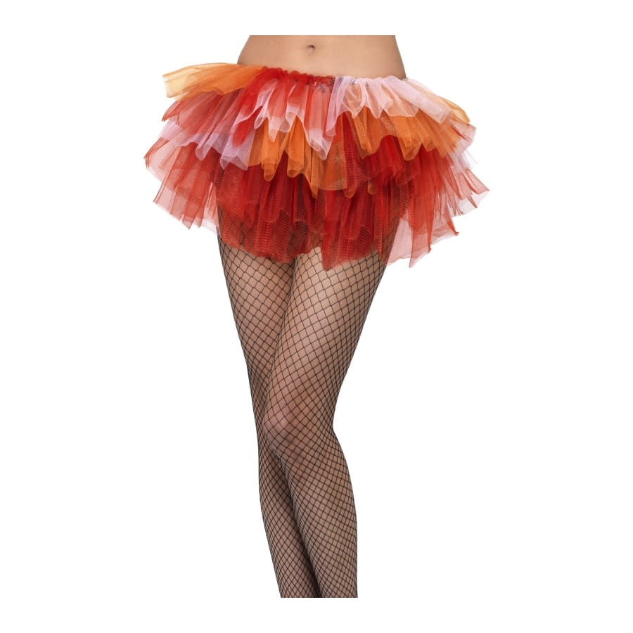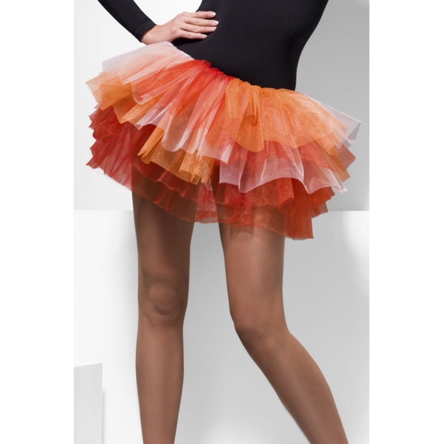 Jupon en tulle pour femme. Ce jupon est composé d'une multitude de couches de couleur orange, rouge et rose pâle. Il peut vous aider à compléter un déguisement de danseuse, de fée ou de princesse.
