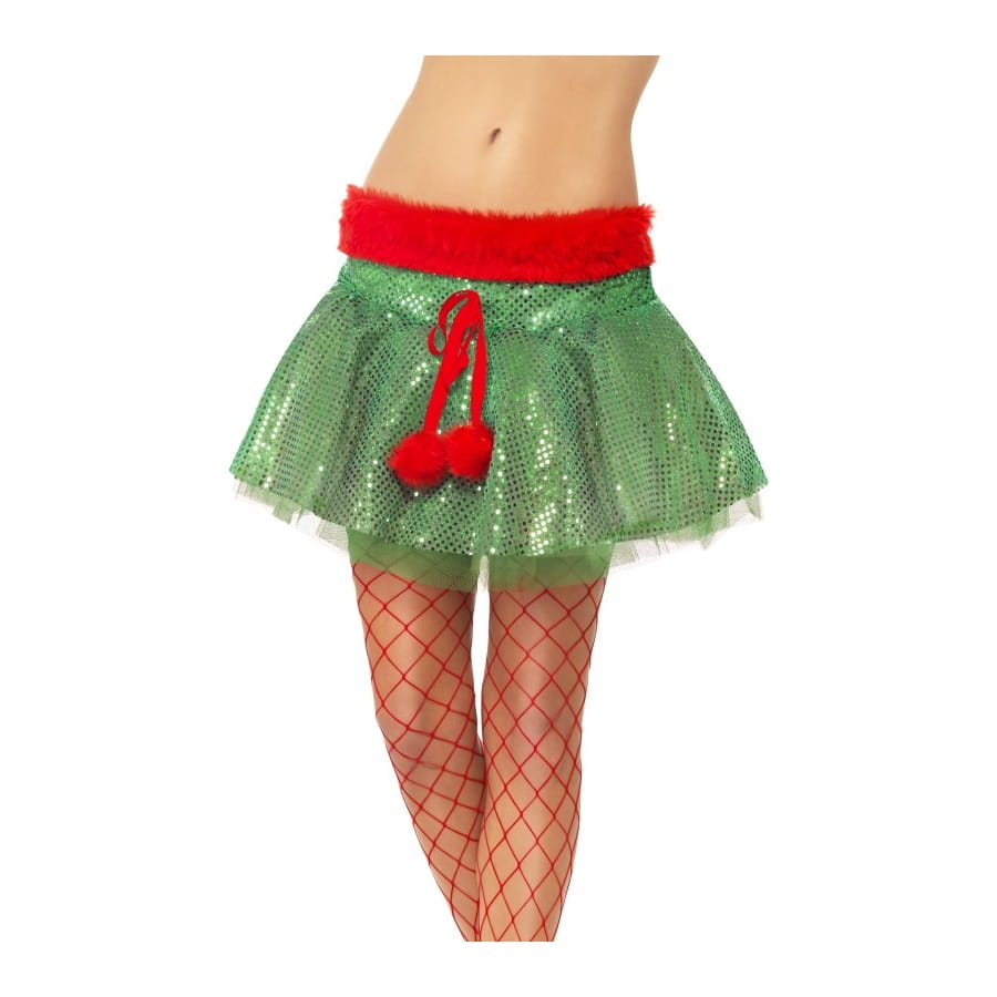 Petit jupon sexy de couleur verte avec ceinture et pompoms rouges, pour femme ou adolescente. Complétez votre déguisement d'elfe ou de lutin de Noël de façon coquette avec ce joli jupon brillant!