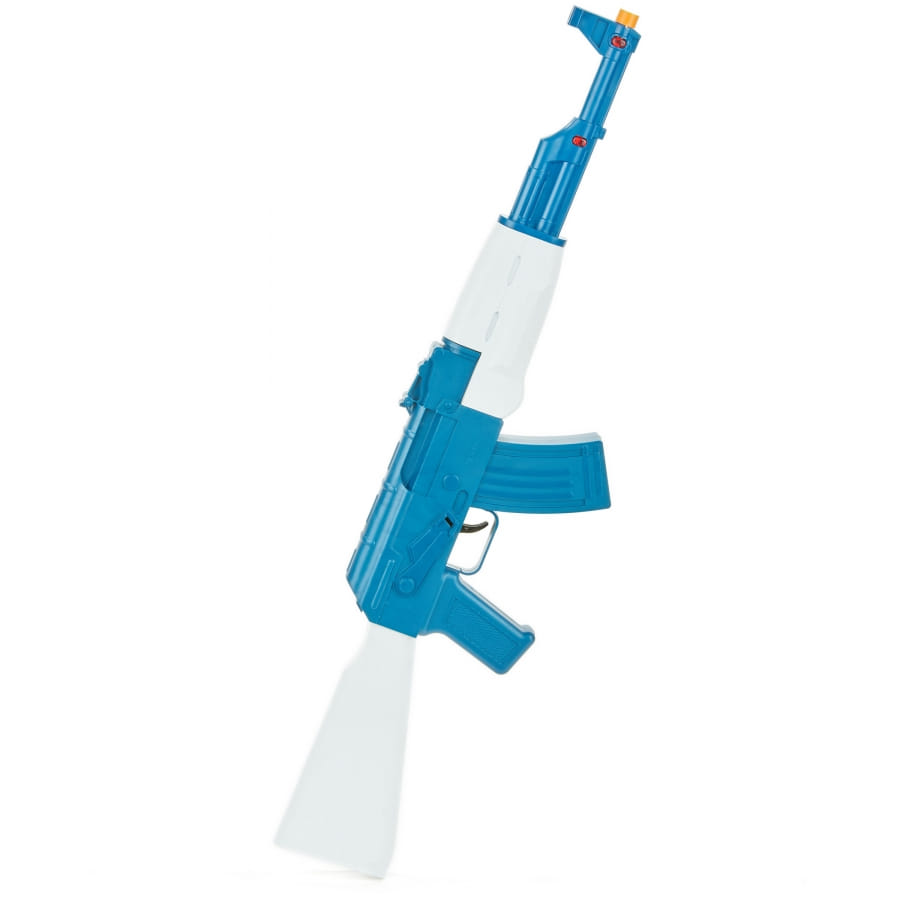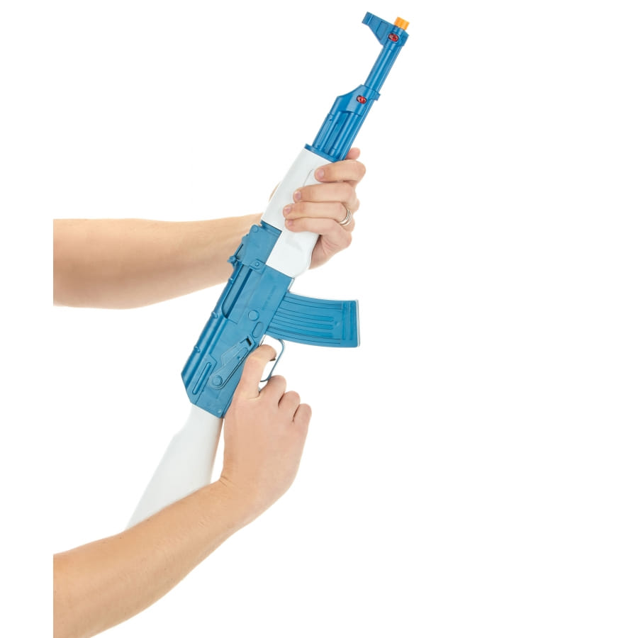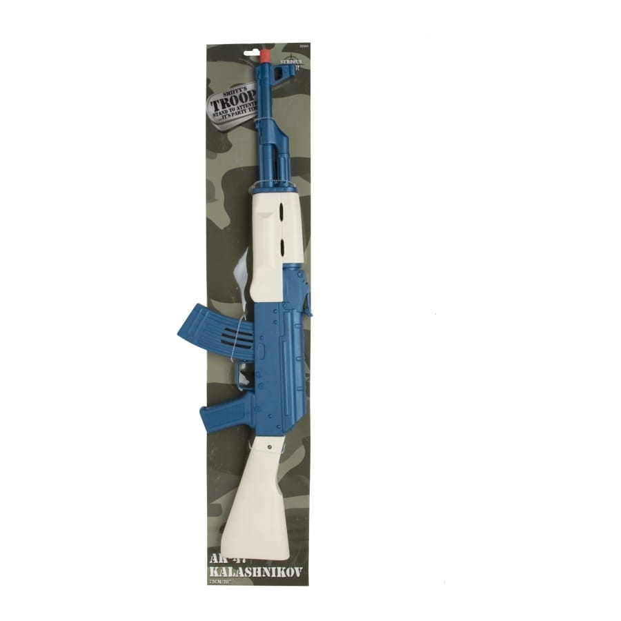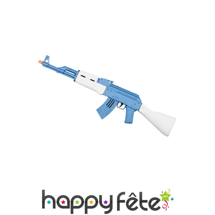 Kalashnikov de couleur bleue et blanche, pour homme ou garçon. Cet accessoire mesure 72 centimètres de long. Inoffensif, il vous permettra de compléter votre déguisement de soldat, d'officier ou de guerrier avec perfection.
