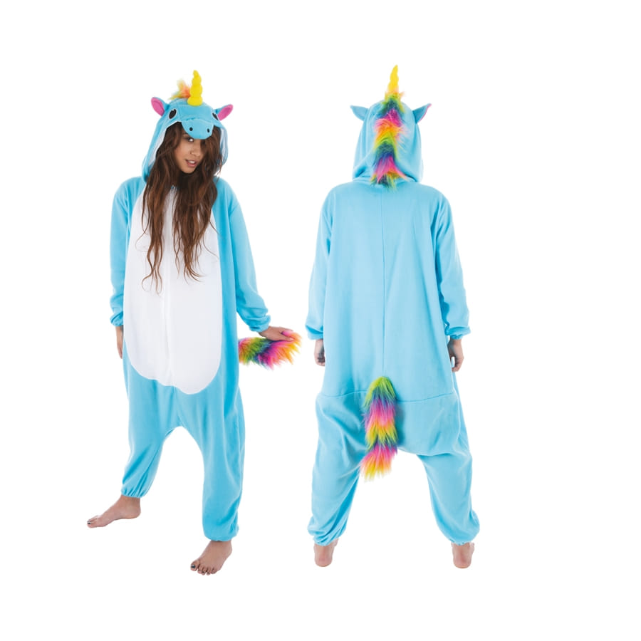 Souhaitez la bienvenue à la licorne ! Cette créature unicorne s'invite dans votre univers à travers un concept japonais devenu très populaire : le kigurumi. Enfilez votre déguisement kigurumi licorne bleue pour interpréter votre propre personnage de conte de fée à un carnaval ou à un événement à thème. Ce modèle est principalement de couleur bleu clair. Il est constitué par une combinaison à capuche ample et très agréable à porter. Les manches sont longues et une adorable queue multicolore a été cousue à l'arrière. Le devant du vêtement est de couleur blanche. La capuche représente une tête de licorne. Elle est équipée d'une crinière multicolore assortie à la queue, de deux oreilles pointues qui dépassent, ainsi que d'une corne située juste sur le sommet.