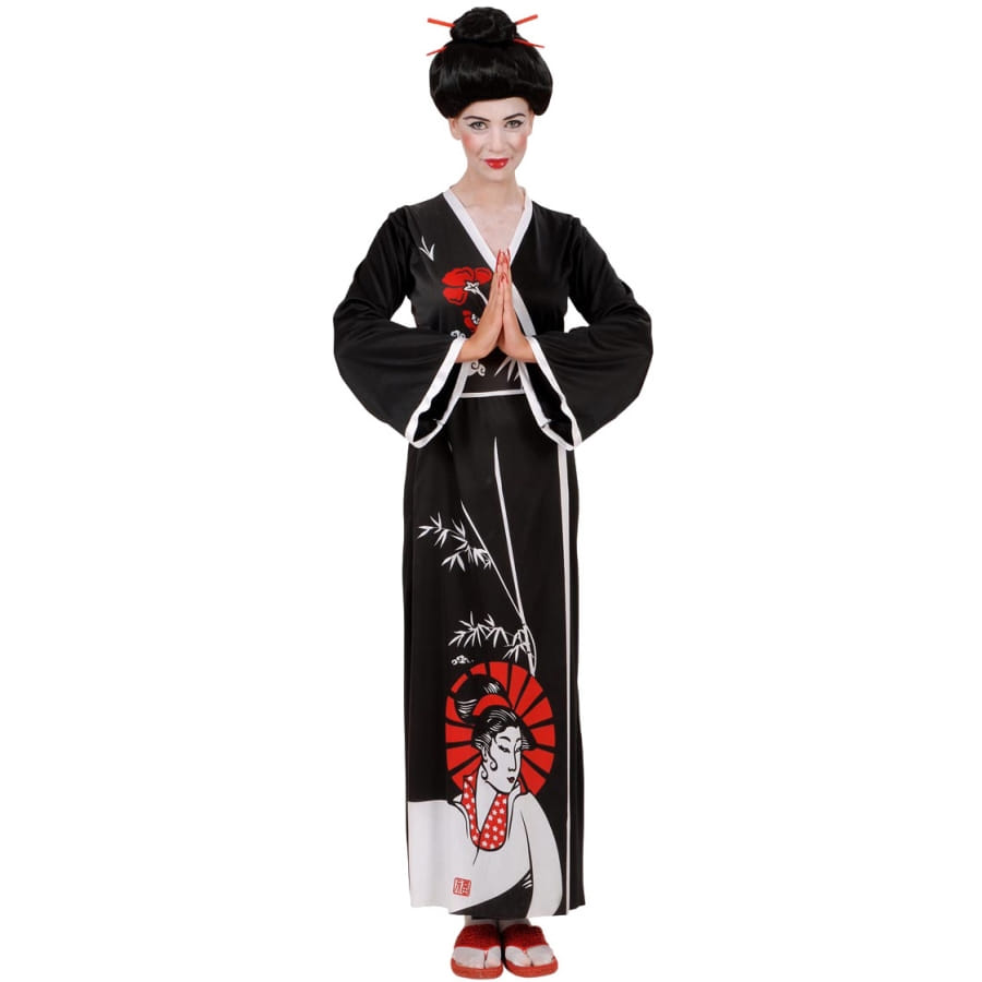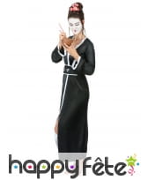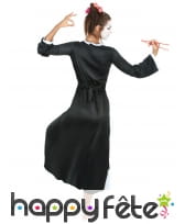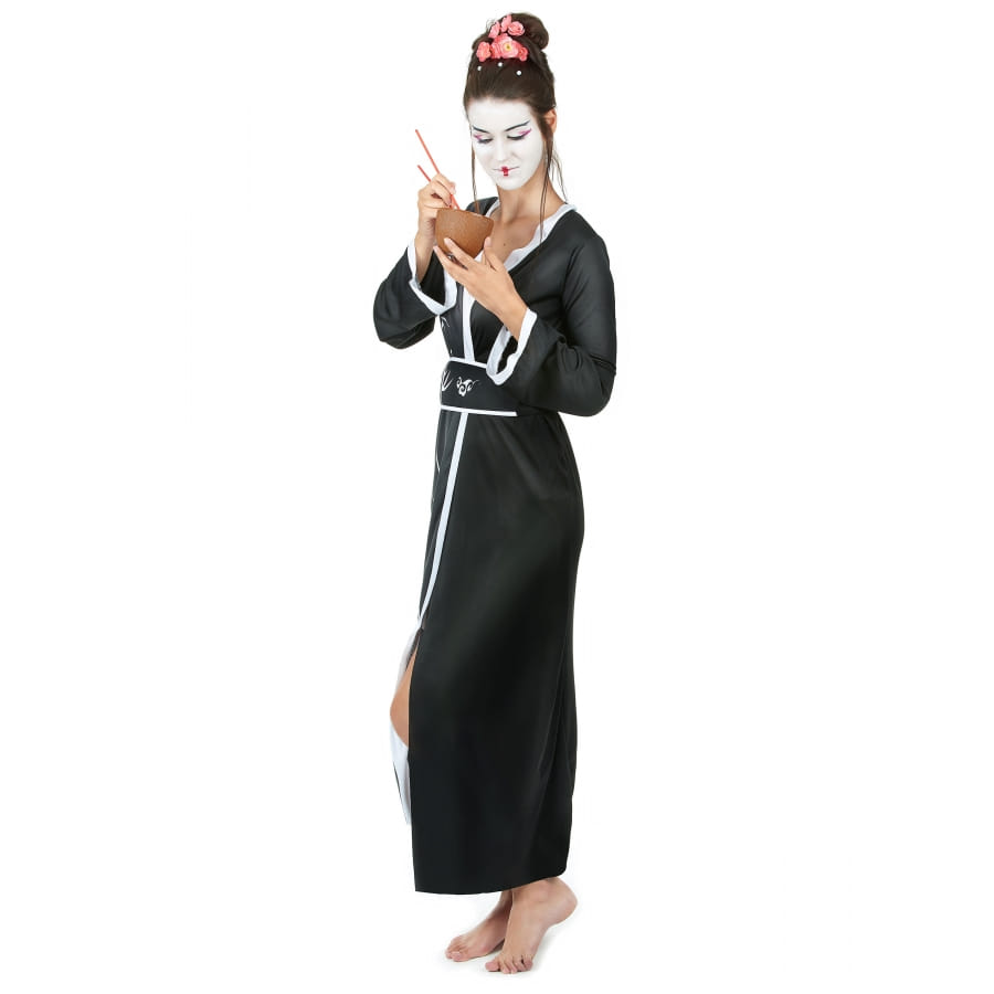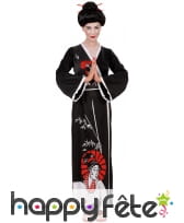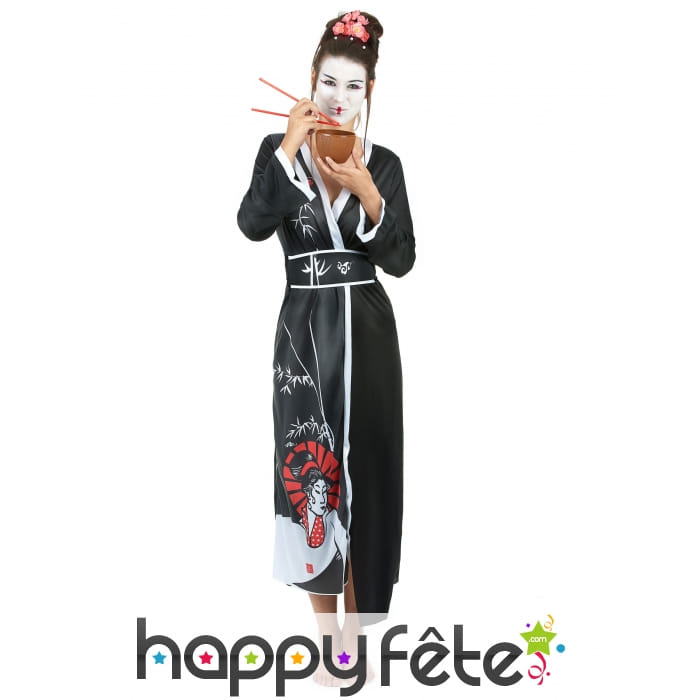 Vivez la culture japonaise en enfilant ce kimono de geisha noir pour femme, très habillé. Nous avons ici un long kimono à hauteur des chevilles, ouvert sur le devant. Il est fait d'un satin noir fin imitation soie, bordé d'une bande blanche jusqu'au bout des manches, et sa partie droite est imprimée de jolis motifs type geisha. Le kimono se referme devant grâce à son obi, en large bande de satin noir imprimé, bordé d'un liseré blanc. Pour être une vraie geisha, coiffez-vous avec un gros chignon maintenu par des épingles et ornez-le d'une fleur. Fardez-vous le visage en blanc et insistez sur le rouge à lèvres. Nous avons des perruques à thème asiatique si vous n'avez pas de longs cheveux, ainsi que de nombreux produits cosmétiques pour vous maquiller.