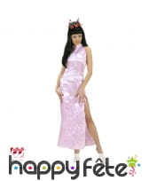 La coupe de la robe imite un kimono qui ferme sur le côté droit, avec un Mao bien évident au niveau du cou.