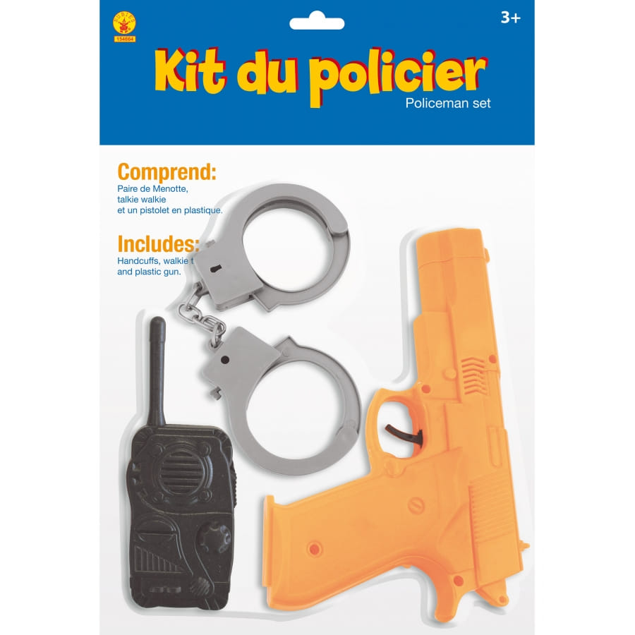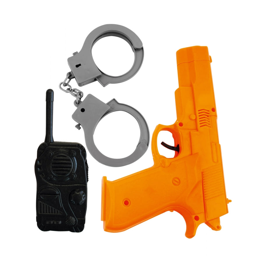 Il comporte un talkie walkie, une paire de menottes et un pistolet.