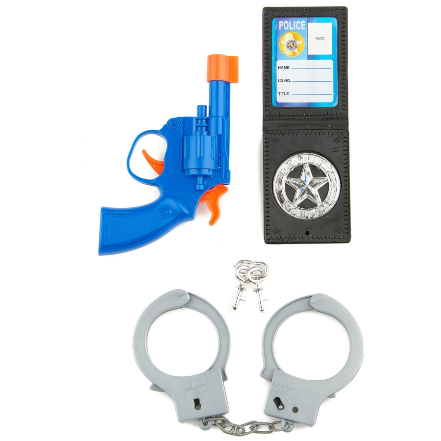 Il s'agit d'un pistolet de couleur bleu, un porte-feuille avec un insigne de police, des menottes en imitation métal et de fausses clés.