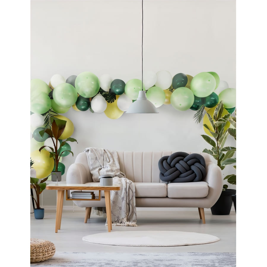 Commençons par les ballons. Ah, ces merveilleux ballons! Vous aurez de quoi varier les plaisirs : 30 ballons mesurant 25 cm, 38 autres coquets petits ballons de 13 cm, et pour couronner le tout, 2 ballons imposants de 30 cm. Avec un dégradé allant du blanc pur au vert foncé en passant par des nuances de vert clair et de jaune solaire, votre arche aura de quoi faire des jaloux!