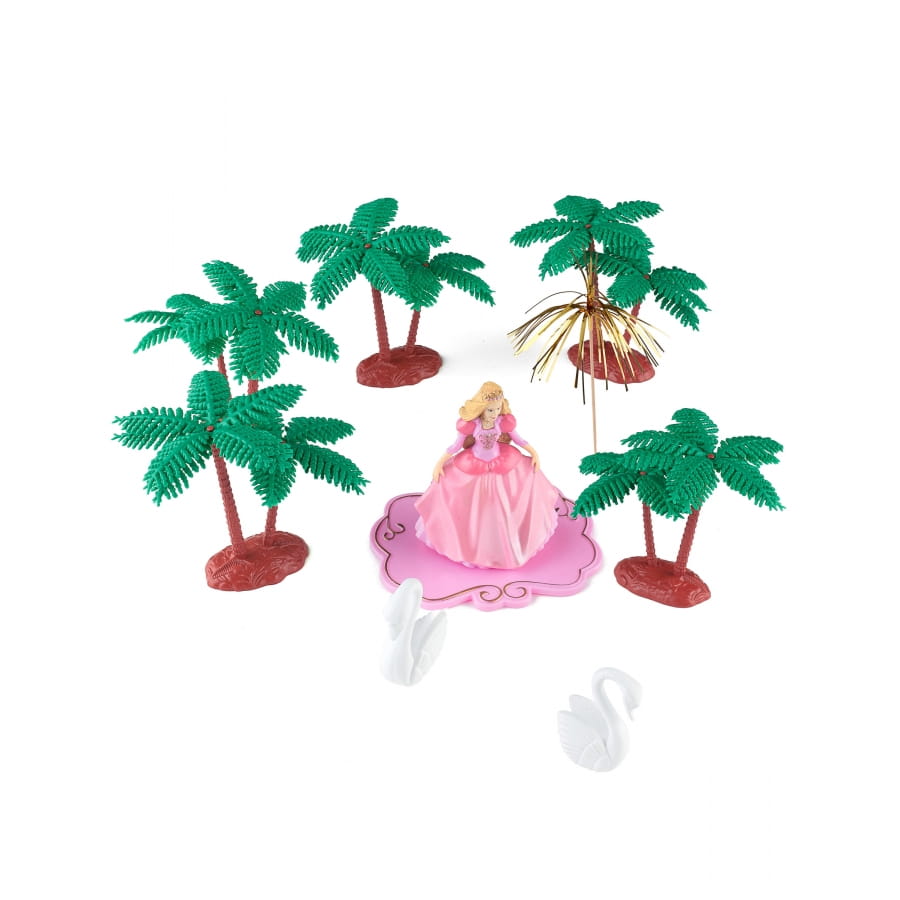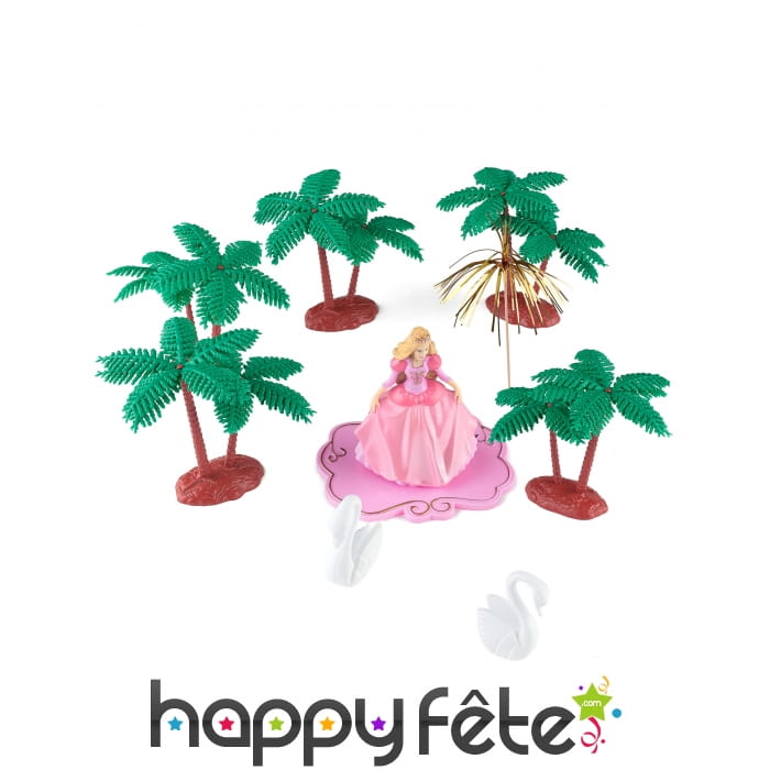 Le kit contient 5 palmiers, 1 pic à cocktail, 1 figurine Barbie et 2 cygnes.