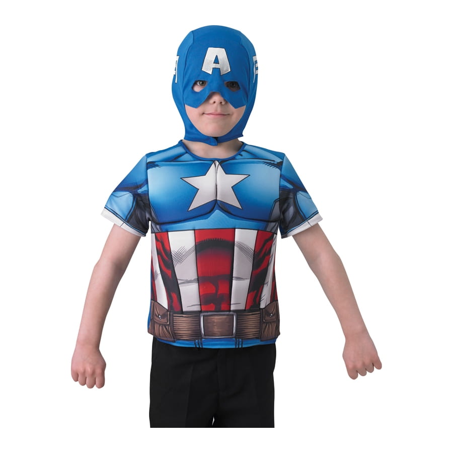 Ce kit Captain America pour enfant est composé d'un plastron 3D et d'une cagoule. Le plastron est de couleur bleu, rouge et blanc, il reproduit à la perfection le buste du fameux super-héros de l'Amérique. La cagoule est également très fidèle à l'original. Il est bleu avec la lettre A imprimé en blanc sur le devant. Voilà un déguisement qui va plaire à tous les petits garçons ! Pour eux, la tendance est aux super-héros ! Si Captain America est le héros préféré de votre enfant, n'hésitez pas à lui offrir ce superbe déguisement à l'occasion de son anniversaire ou d'une fête d'école... Et n'oubliez pas son redoutable bouclier, qui est également disponible sur notre boutique en ligne !