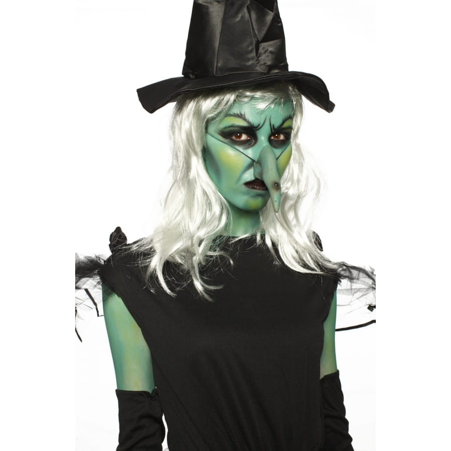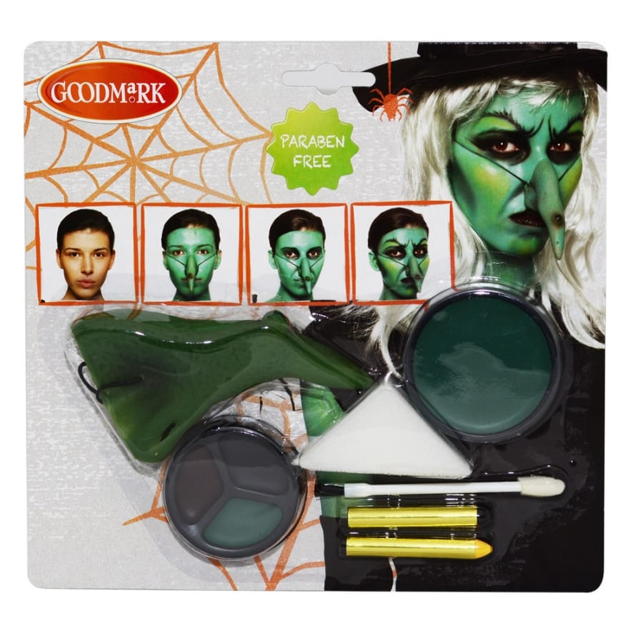 Mesdames, si vous voulez vous déguiser en sorcière pour la fête des morts, préférez un cosmétique adapté. Nous vous proposons, sur notre site, un Kit costmétique maquillage de sorcière verte. Il se compose d'un nez de sorcière avec élastique, d'une palette de maquillage gras vert de 11g, d'une palette de 3 couleurs vert, marron et noir de 1.8g, de 2 crayons noir et jaune, ainsi que d'une éponge et d'un pinceau pour l'application.