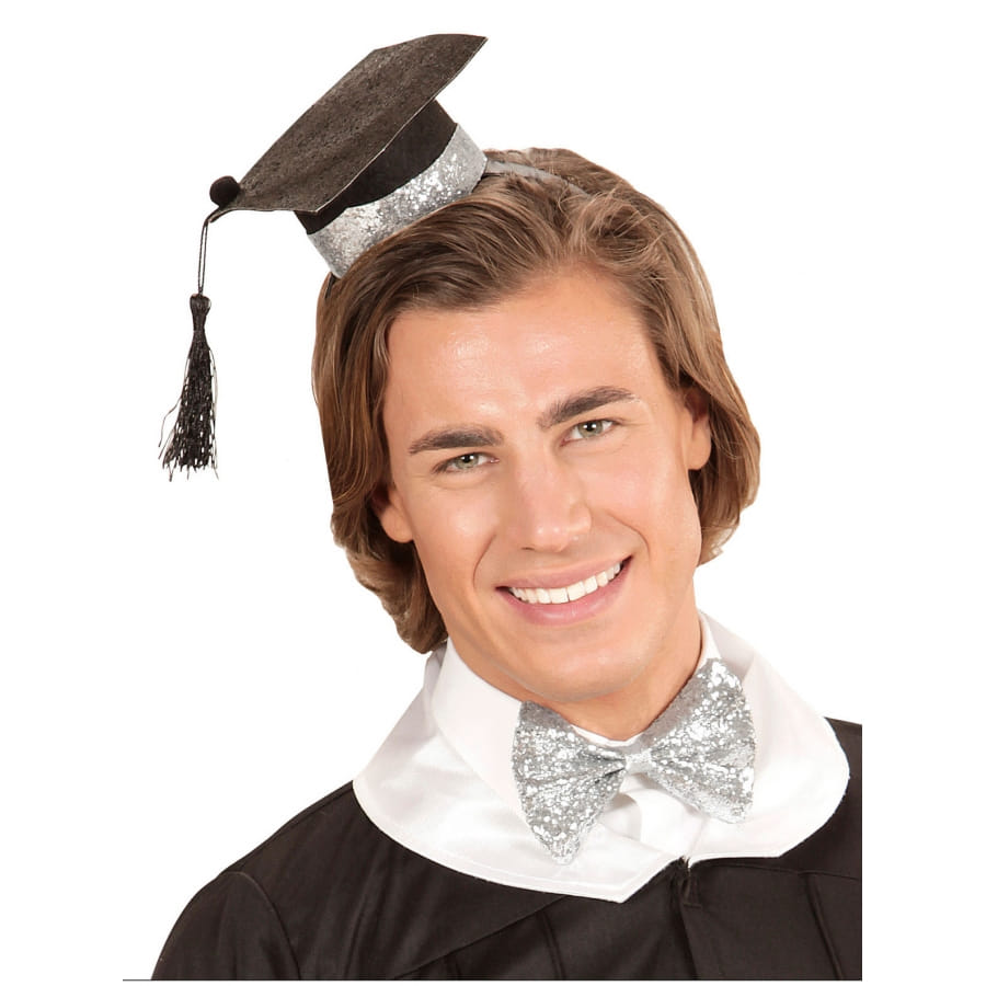 Il comprend un serre-tête surmonté sur le côté d'une petite coiffe d'étudiant et un noeud papillon argenté avec des paillettes.
