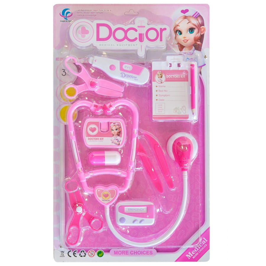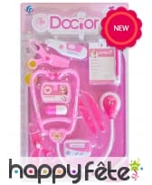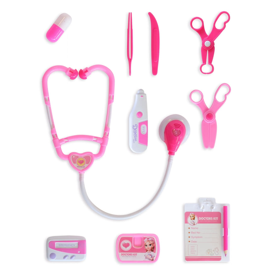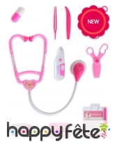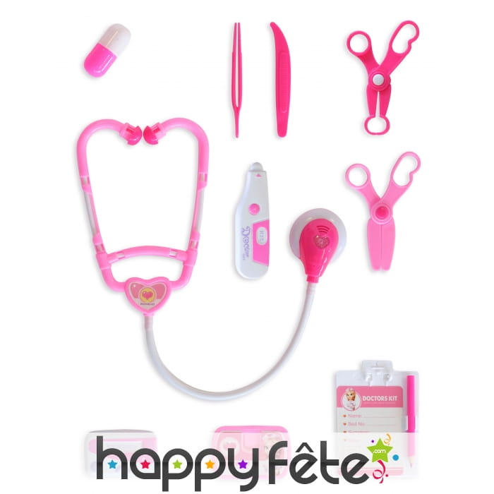 Le kit contient 10 éléments de la panoplie du médecin et joue sur les couleurs blanche et rose.