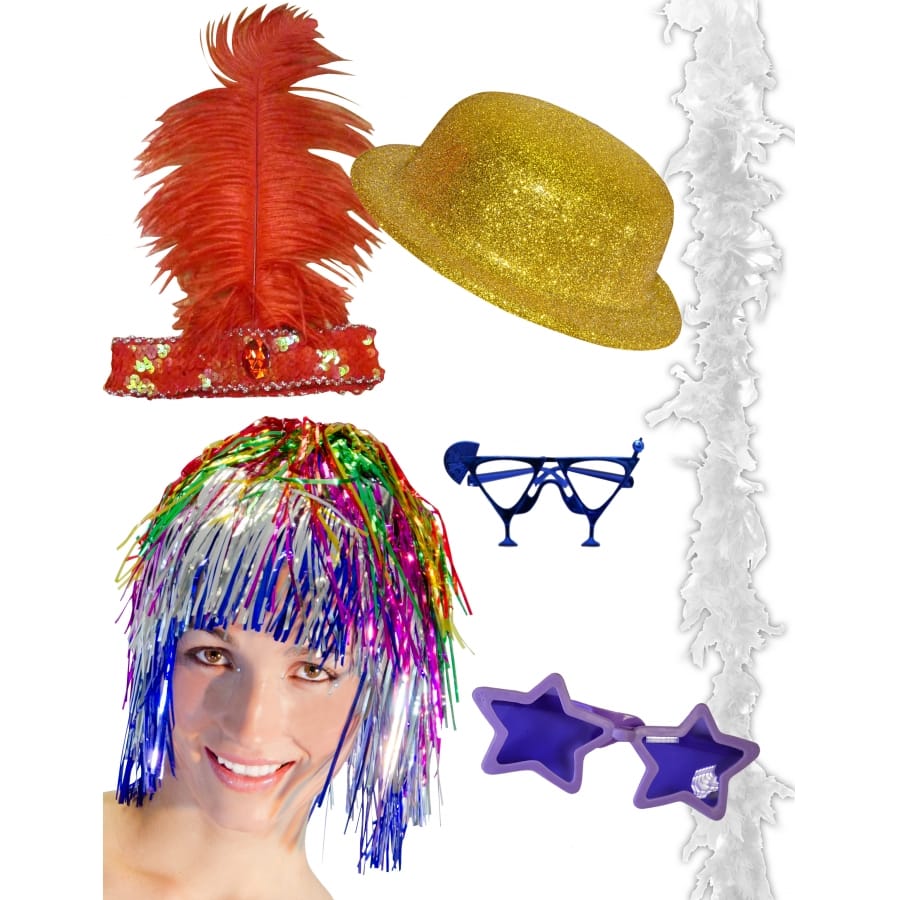 Voici un super kit pour déguiser toute la famille ou toute une bande d'amis, en effet, il comprend des accessoires pour 12 personnes. A tous les goûts et de toutes les couleurs, chaque membre de votre petit groupe y trouvera sûrement son accessoire de prédilection. Nous avons 2 boas de 50 g, 2 chapeaux melon pailletés, 2 paires de lunettes cocktail, 2 paires de lunettes géantes et 2 bandeaux charleston. Enfilez votre accessoire, et surtout amusez-vous bien !