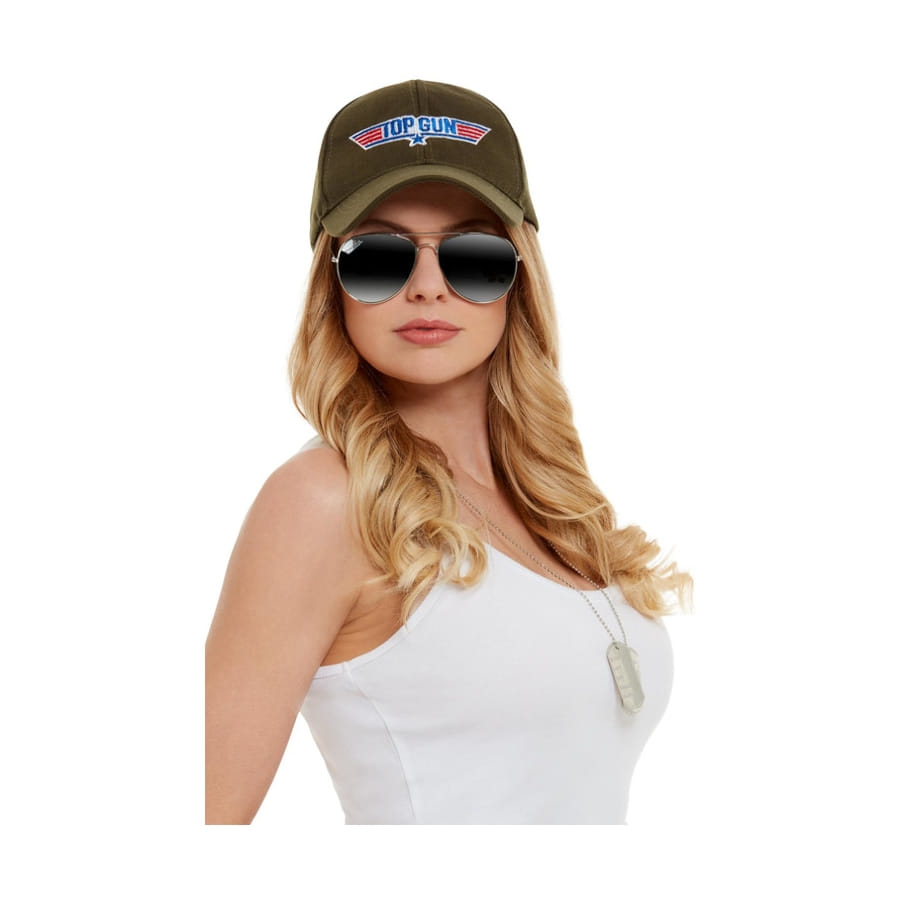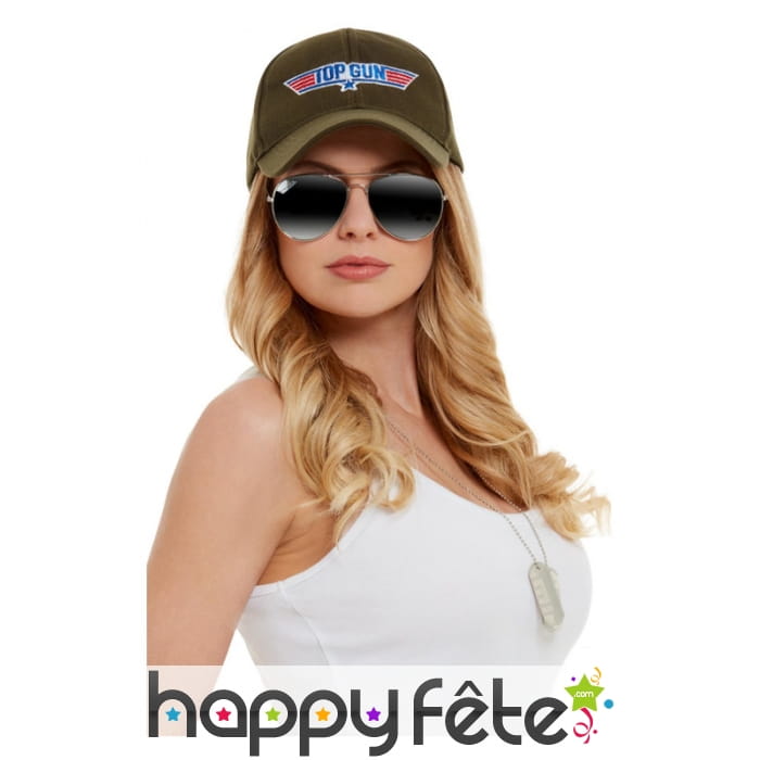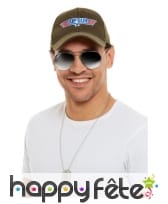 La casquette à visière est kaki et imprimée de l'inscription TOP GUN en bleu sur fond blanc accompagné du drapeau américain.