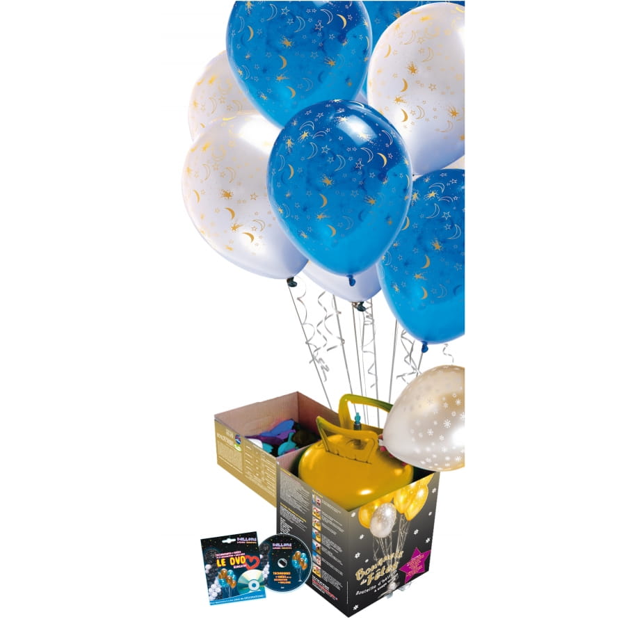 Kit d'hélium contenant une bouteille de 0.25 mètres cubes, 16 ballons blancs et bleus imprimés mesurant 25 centimètres de diamètre et d'un DVD contenant des idées et des astuces pour vous aider à mieux vous servir du kit. Il faut laisser le robinet ouvert pour vider la bouteille et ensuite l'emmener dans un centre de recyclage d'acier. Ce kit est parfait pour un anniversaire.