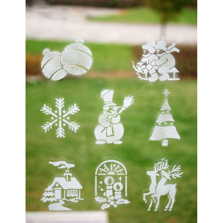 Les fêtes de fin d'année et les décorations de Noël vont toujours de pair. Laissez-vous envahir par une ambiance hivernale en vous munissant de ce kit de 8 pochoirs de Noël. La feuille présente différents motifs : sapin, boules de Noël, rennes, flocons de neige, enfants faisant de la luge, bougies, bonhomme de neige et chalet. Pour les placer, il faudra prendre un modèle, le positionner, puis remplir le pochoir de fausse neige en spray. Le résultat sera magique !
