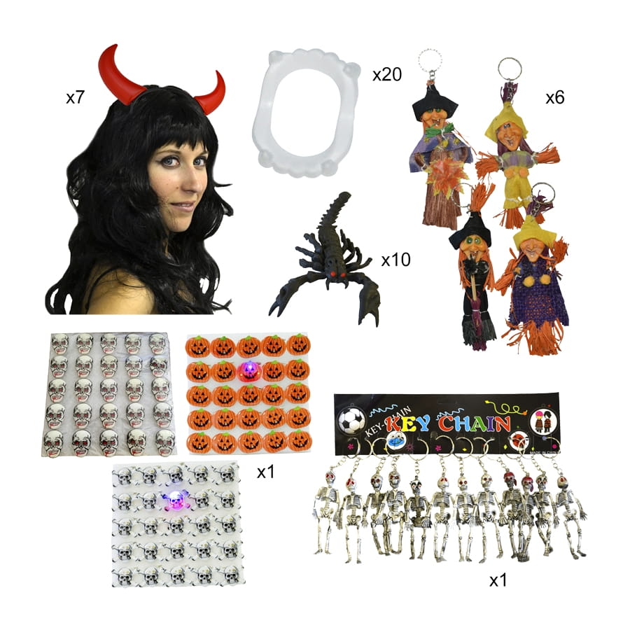 Organisez la plus belle soirée d'Halloween de tous les temps ! Impressionnez vos invités avec le kit de 80 cadeaux Halloween. Une noyade d'articles multicolores sera entre vos mains, à offrir en guise de cadeau souvenir ou à faire remporter à vos convives à travers des jeux. Le kit comprend 7 serres tête de diable, 20 dentiers de vampires, de couleur blanche, et 10 scorpions décoratifs en plastique. Vous disposerez aussi d'une planche de 25 broches lumineuses, avec des motifs citrouilles ou têtes de mort ; notez que vous n'aurez pas le choix du modèle. Un lot de 6 portes clés sorcières et un lot de 12 portes clés squelette complètent l'ensemble. Que des merveilles pour un Halloween mémorable !