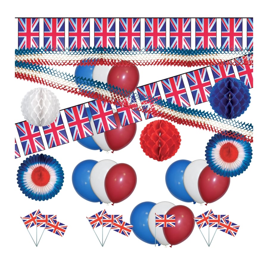Voici ce que nous avons dans ce kit de décoration : 15 ballons en bleu, blanc et rouge, 3 boules en papier de 32 cm de diamètre, de la même couleur, 2 guirlandes iris en papier de 3 m de longueur, 2 guirlandes en plastique de 4 m avec des pavillons du Royaume Uni et 2 éventails tricolores d'un diamètre de 36 cm,10 drapeaux de 9.5 cm X 16 cm. Du bleu, du blanc et du rouge, tout ça pour célébrer comme il se doit la saint-Georges ou pour supporter une équipe anglaise tout simplement ! Consultez le site pour des kits de décoration d'autres pays.