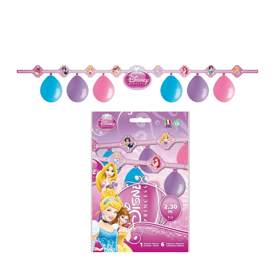 Votre petite princesse ne peut en aucun cas célébrer son anniversaire sans ses amies du merveilleux monde de Disney. Organisez une fête inoubliable en vous munissant de ce kit de décorations princesses Disney. Il contient 6 ballons roses et violets, de 21 cm de dimension chacun. Une guirlande de couleur assortie est également fournie pour compléter le kit.
