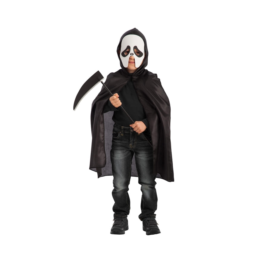 Les histoires de maison hantées en ont fascinés plus d'un ! Laissez votre fils incarner le petit fantôme d'Halloween en vous équipant du super kit de fantôme pour enfant. L'article est constitué d'un set intégral avec une cape à capuche, un masque et une faux en guise d'accessoire. La cape est présentée en noir et elle est dotée d'une petite capuche de la même couleur. Le masque est de couleur blanche et noire. Il recouvre entièrement le visage, avec des trous pour les yeux et un emplacement pour le nez et la bouche. Le petit fantôme a aussi droit à une fausse arme. La faux est de couleur noire avec une forme bien pointue.