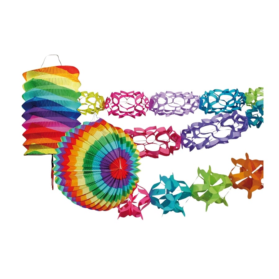 Optez pour une décoration où les belles couleurs sont à l'affiche ! Pour un anniversaire ou à l'occasion d'un carnaval, n'hésitez pas à essayer ce kit de lampions et guirlandes bariolés. Il est composé de 3 guirlandes de 2,5 m de long chacune, d'un lampion de cylindrique bariolé de 16cm de dimension, et d'un lampion ballon bariolé de 22 cm de diamètre. Le tout vous est présenté dans de multiples couleurs vives et éclatantes !